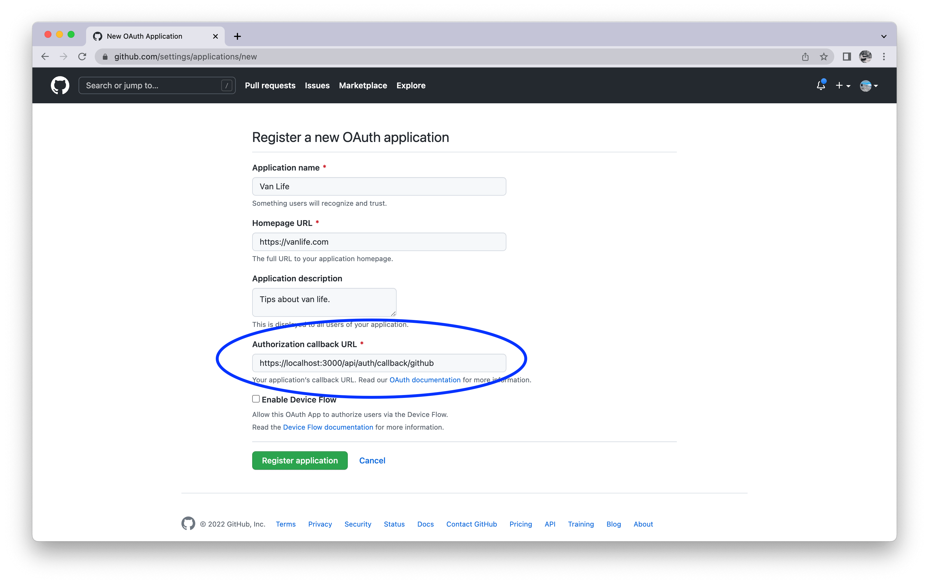 If we were to deploy our app to production, we would need to create a new OAuth App in GitHub (calling it something like "Van life β prod") and point the callback URL to our production domain: https://example.com/api/auth/callback/github